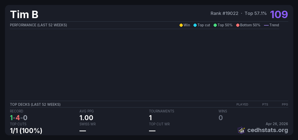 | Tournament | Deck | Result | Record | PPG | Points ? |