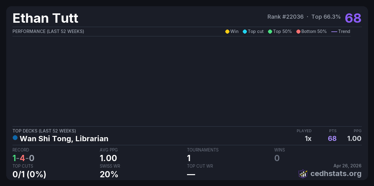 | 100% Dual Land CEDH Tournament Apr 25, 2026 | Wan Shi Tong, Librarian | 21/32 | 1-4-0 | 68 |