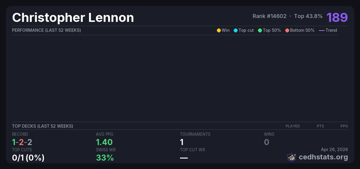 | 100% Dual Land CEDH Tournament Apr 25, 2026 | — | 13/32 | 1-2-2 | 189 |
