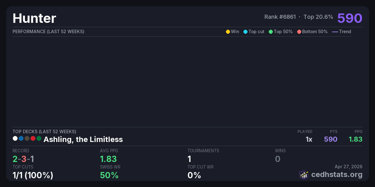 | Pulp Fiction April 2026 CEDH Apr 25, 2026 · 21 players | Ashling, the Limitless | 2/21 | 2-3-1 | 1.83 | 590 |