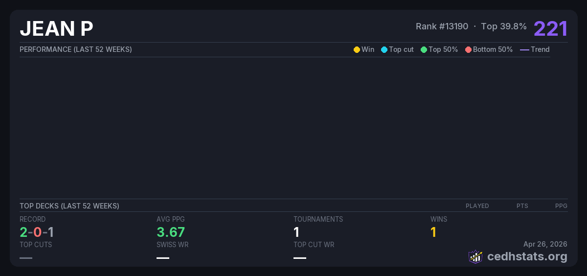 | Tournament | Deck | Result | Record | PPG | Points ? |