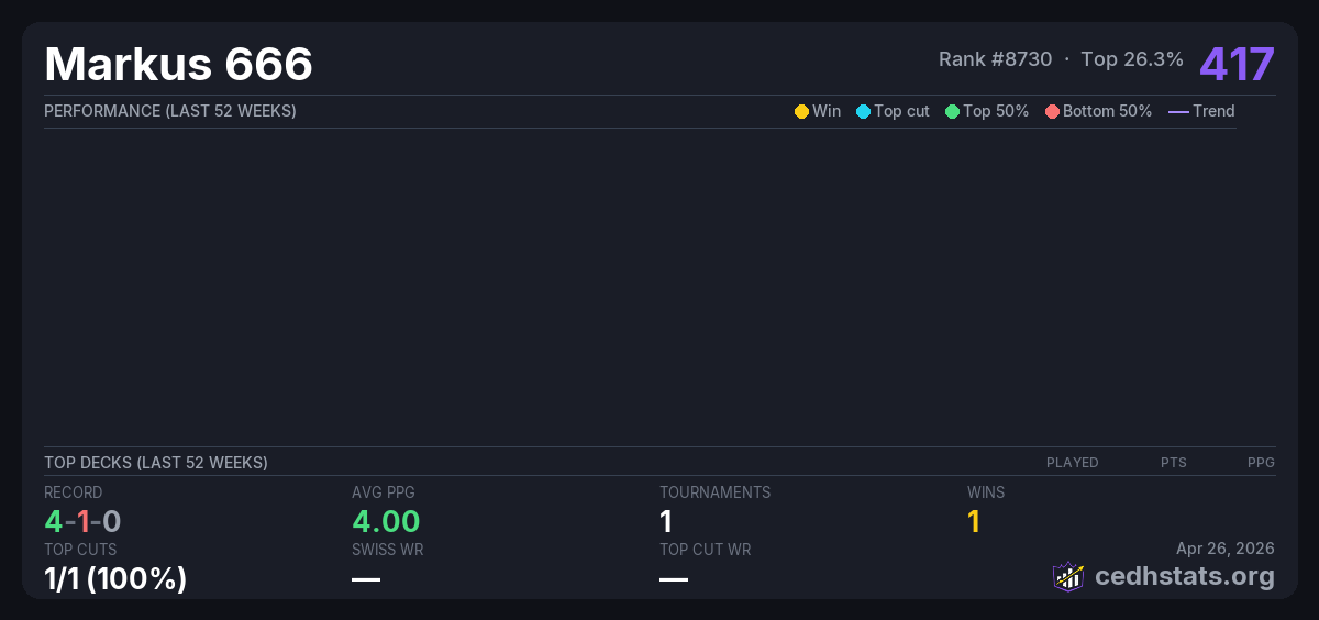 | Zum Waschbären Test Event Oct 21, 2025 · 16 players | Invalid pairing | 1/16 | 4-1-0 | 4.00 | 417 |