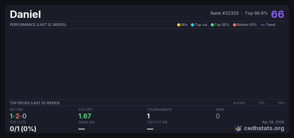| Weekend Warriors Aug 02, 2025 · 16 players | — | 8/16 | 1-2-0 | 1.67 | 66 |