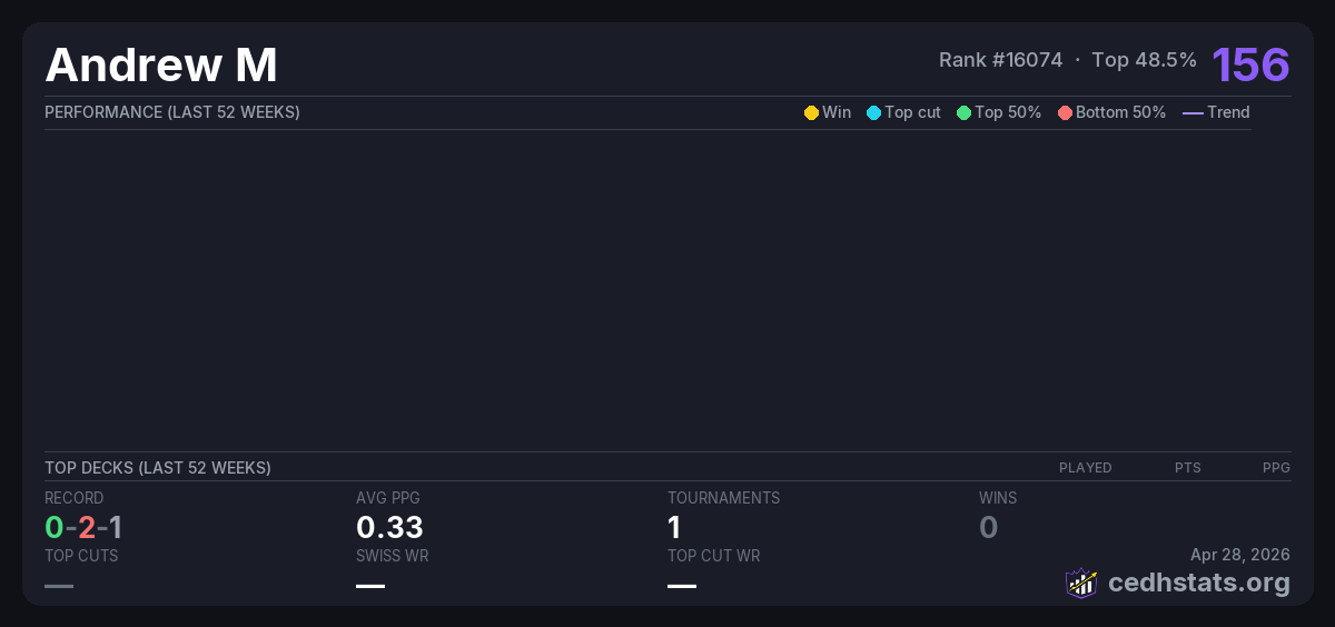 | Commander Precon League 2 Week 3 Aug 30, 2025 · 28 players | Invalid pairing | 9/28 | 0-2-1 | 0.33 | 156 |