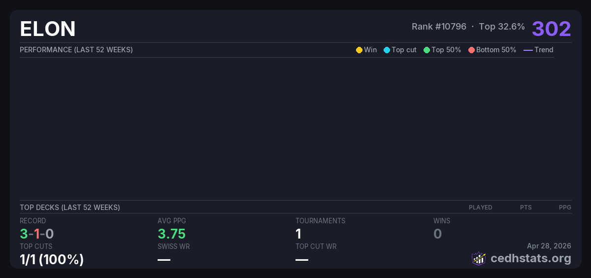 | CEDH Tournament 1 Nov 29, 2025 · 16 players | 2/16 | 3-1-0 | 3.75 | 302 |