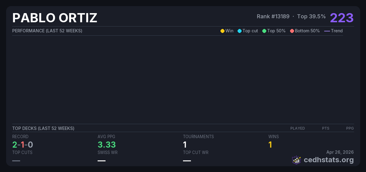 | CEDH Nov 20, 2025 · 16 players | Invalid pairing | 1/16 | 2-1-0 | 3.33 | 223 |