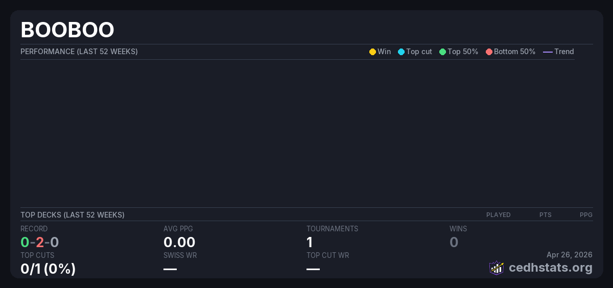 | Tournament | Deck | Result | Record | PPG | Points ? |