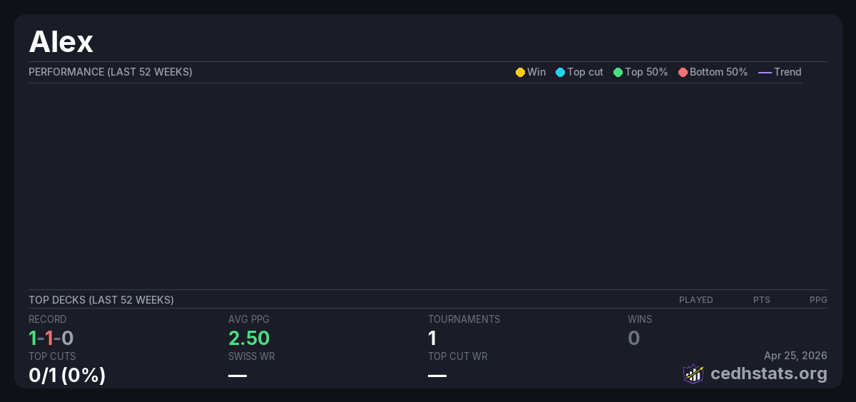 | Tournament | Deck | Result | Record | PPG | Points ? |