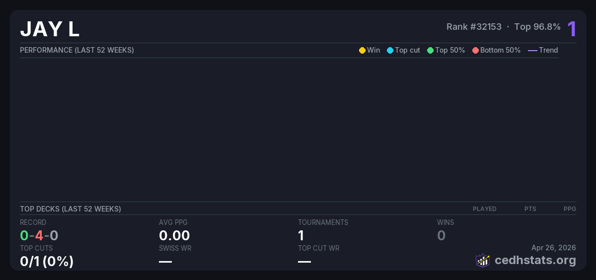 | CEDH SATURDAY Jul 12, 2025 · 16 players | Invalid pairing | 16/16 | 0-4-0 | 0.00 | 1 |