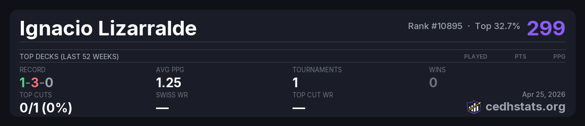 | Torneo Clasificatorio al HoF en el Ojo Apr 26, 2025 · 33 players | Invalid pairing | 13/33 | 1-3-0 | 1.25 | 125 |