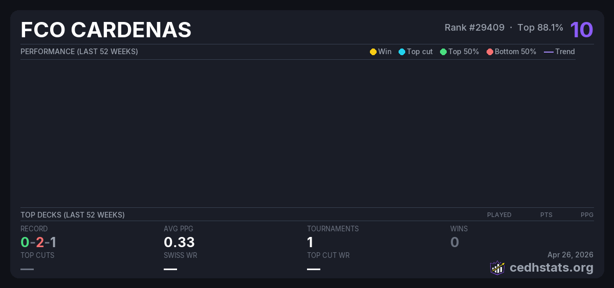 | CIDHACHE Jun 19, 2025 · 20 players | Invalid pairing | 17/20 | 0-2-1 | 0.33 | 10 |