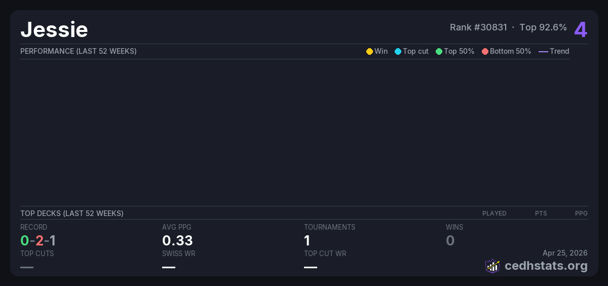 | Commander Precon League 2 Week 5 Sep 13, 2025 · 24 players | Invalid pairing | 22/24 | 0-2-1 | 0.33 | 4 |