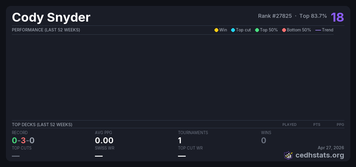 | FNM EDH 11-21-25 Nov 21, 2025 · 28 players | Invalid pairing | 22/28 | 0-3-0 | 0.00 | 18 |