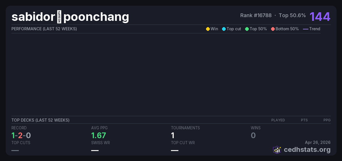 | Bracket 3 Commander Sep 28, 2025 | — | 4/16 | 1-2-0 | 144 |