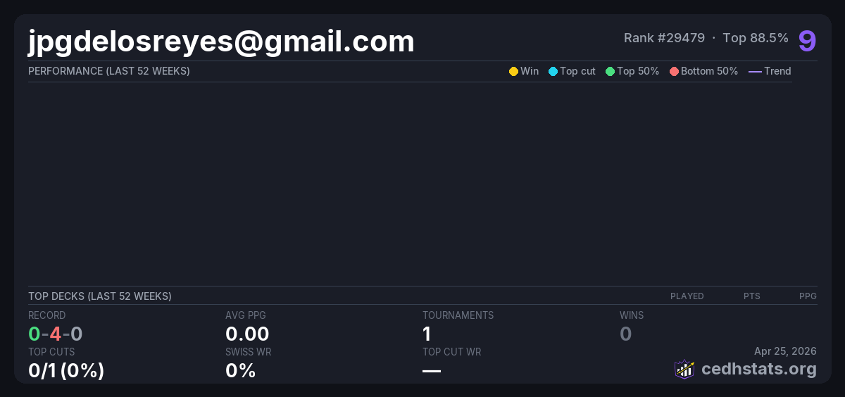 | Team 6750: 2nd Quarter CEDH Tournament Apr 25, 2026 | — | 43/49 | 0-4-0 | 9 |