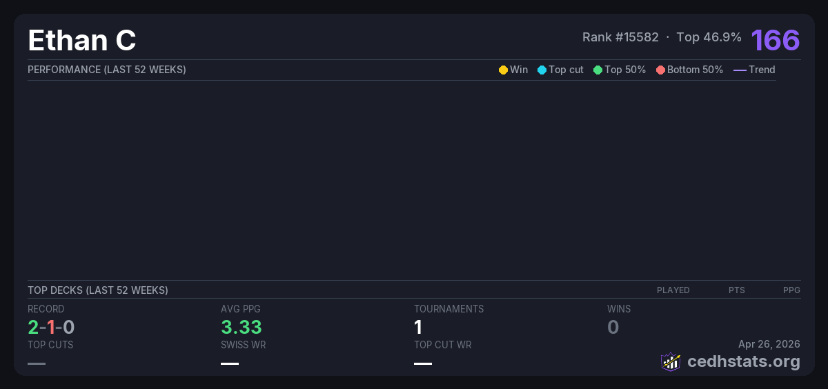 | Casual Saturday Commander - Obsidian Games Jan 11, 2026 · 22 players | 6/22 | 2-1-0 | 3.33 | 166 |