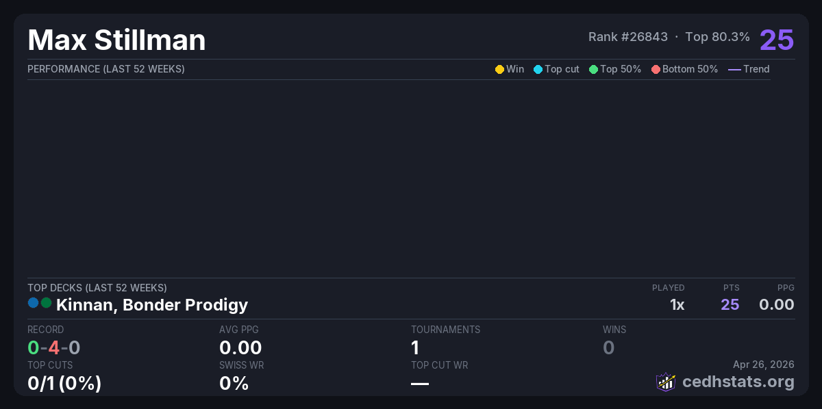 | TITANS OF THE UNDERGROUND - SEASON 2 ROUND 2 Apr 25, 2026 · 47 players | Kinnan, Bonder Prodigy | 40/47 | 0-4-0 | 0.00 | 25 |