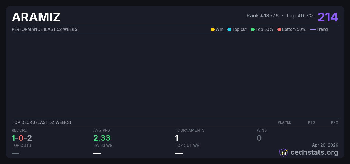 | CEDHH Aug 14, 2025 | Invalid pairing | 2/20 | 1-0-2 | 214 |