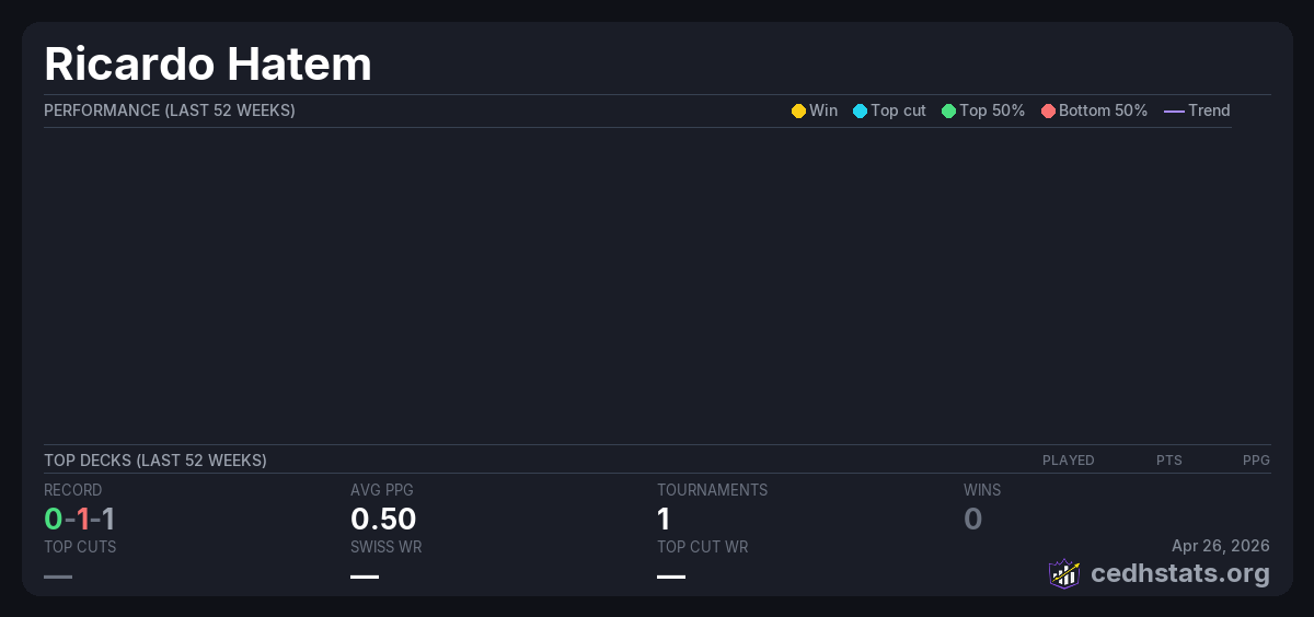 | Casa de Ruter CEDH 21/03/26 Mar 21, 2026 · 16 players | 15/16 | 0-1-1 | 0.50 | — |