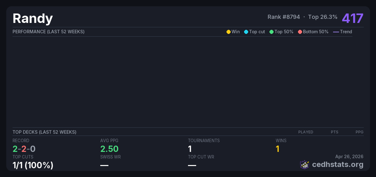 | Tournament | Deck | Result | Record | PPG | Points ? |