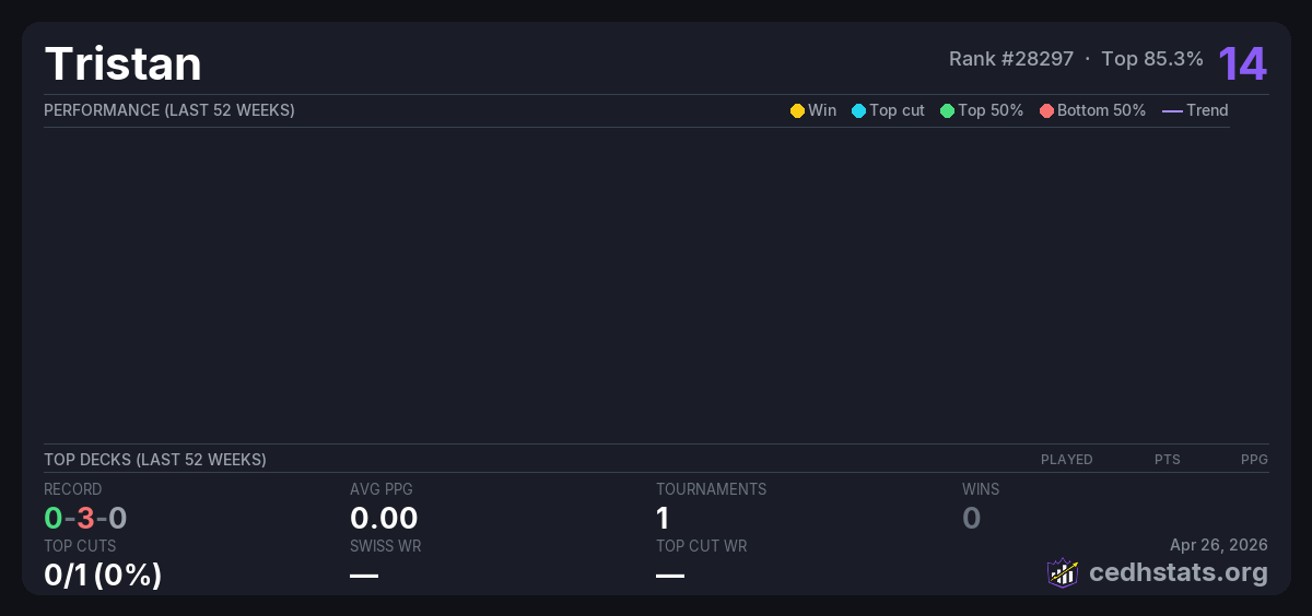 | Tournament | Deck | Result | Record | PPG | Points ? |