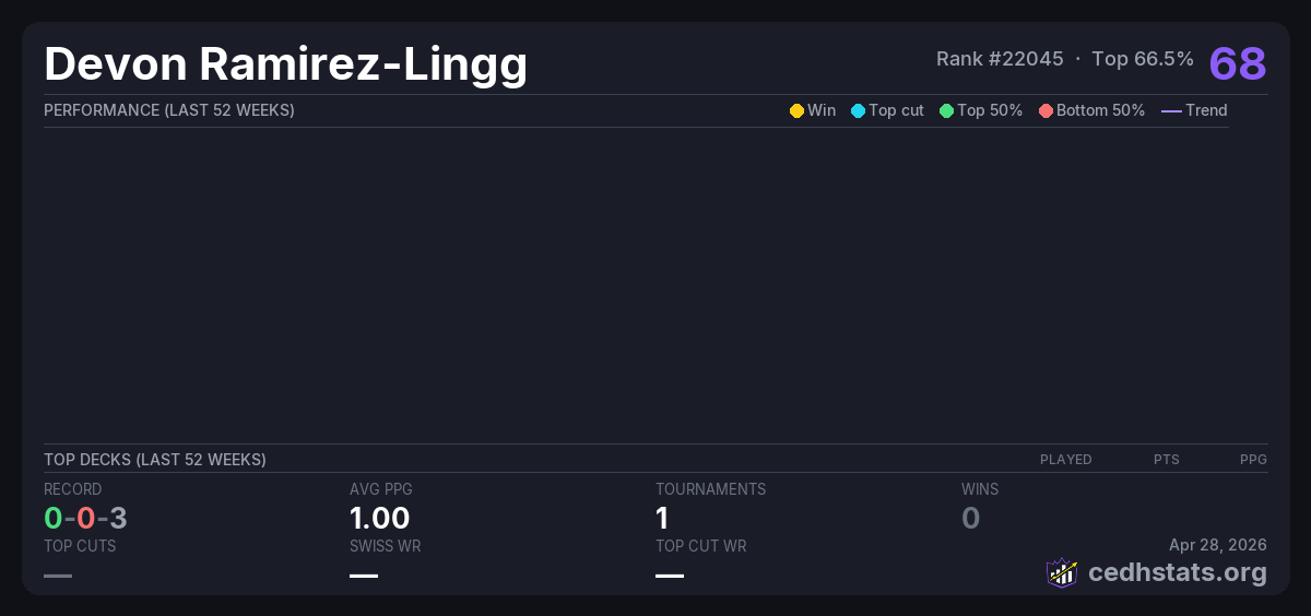 | Commander Tuesday - Nov 4th Nov 05, 2025 | Invalid pairing | 15/27 | 0-0-3 | 68 |