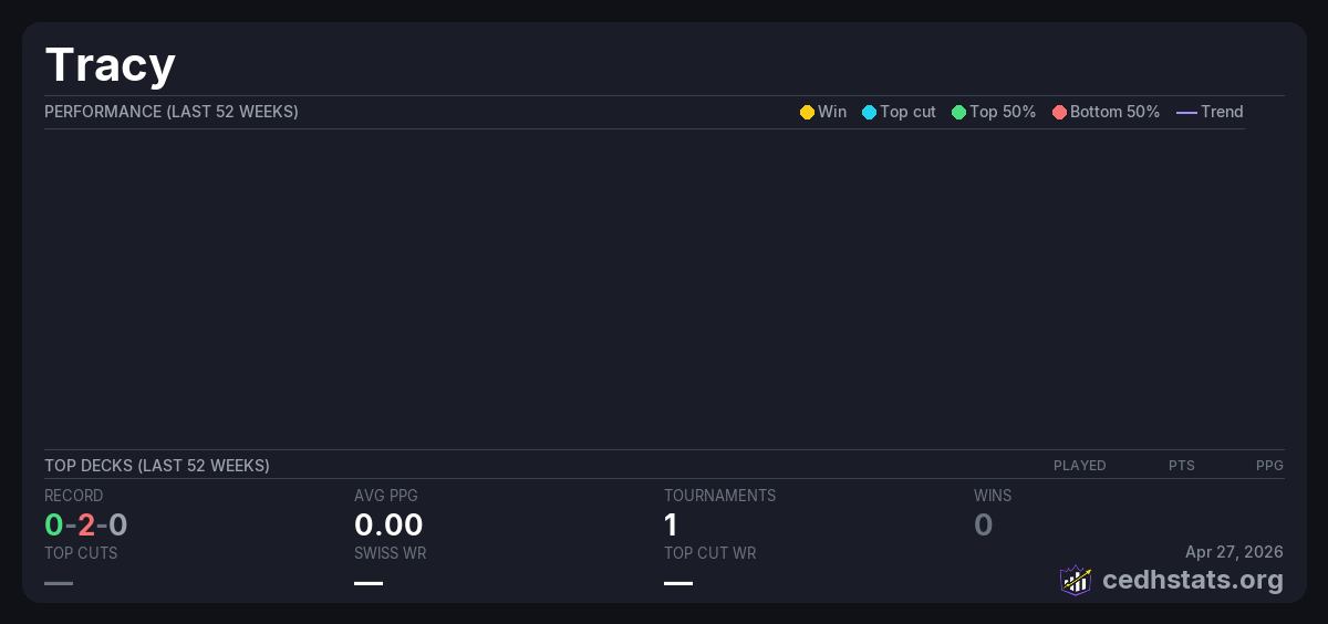 | Tournament | Deck | Result | Record | PPG | Points ? |
