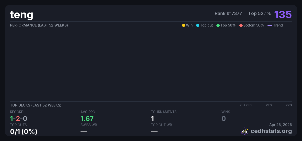 | Bonfire $200 Budget EDH Tournament Apr 26, 2026 | — | 6/20 | 1-2-0 | 135 |