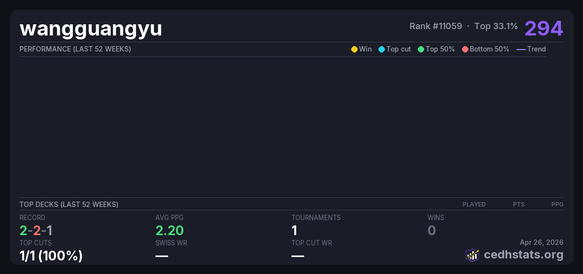 | beijing kadou cedh 2.23 Feb 23, 2026 · 16 players | 2/16 | 2-2-1 | 2.20 | 294 |