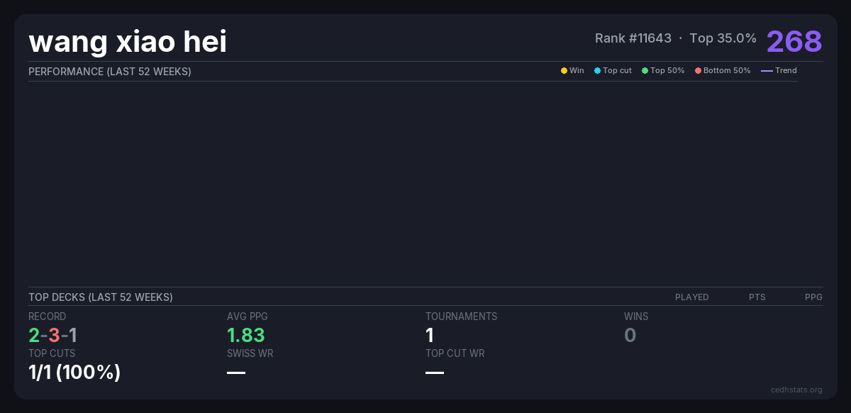 | CommandFest Beijing 2025 Aug 16, 2025 · 60 players | Invalid pairing | 12/60 | 2-3-1 | 1.83 | 268 |