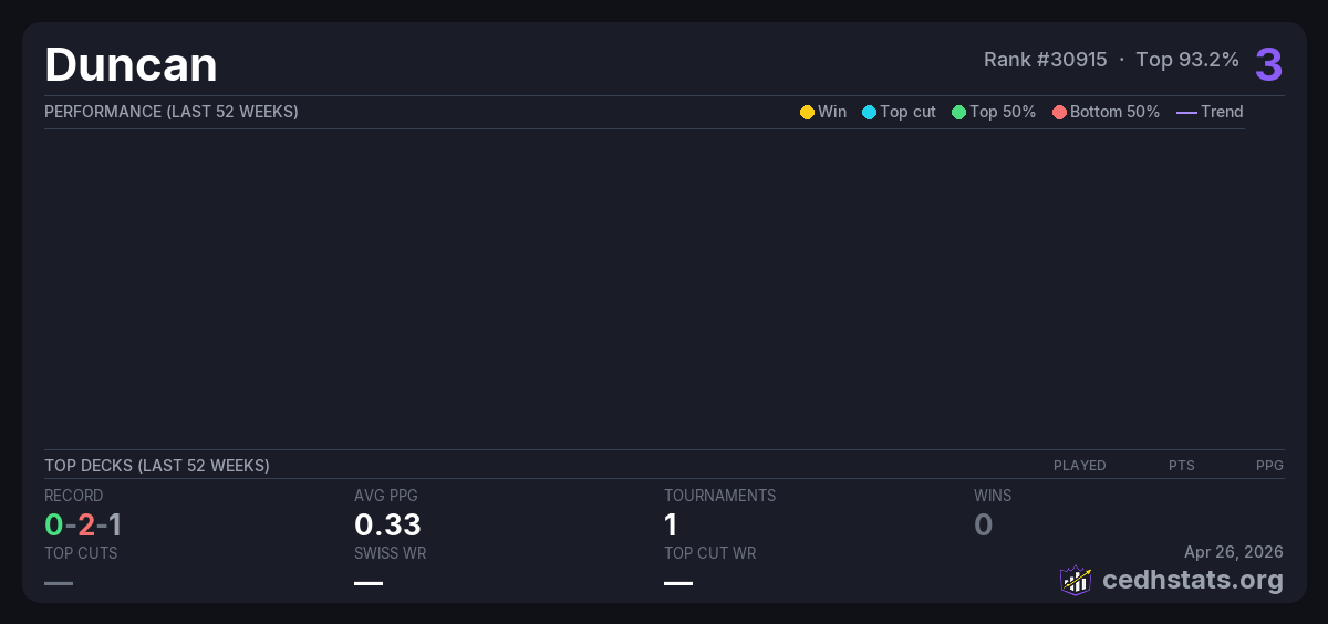 | Commander League 10 Jun 28, 2025 · 16 players | — | 15/16 | 0-2-1 | 0.33 | 3 |