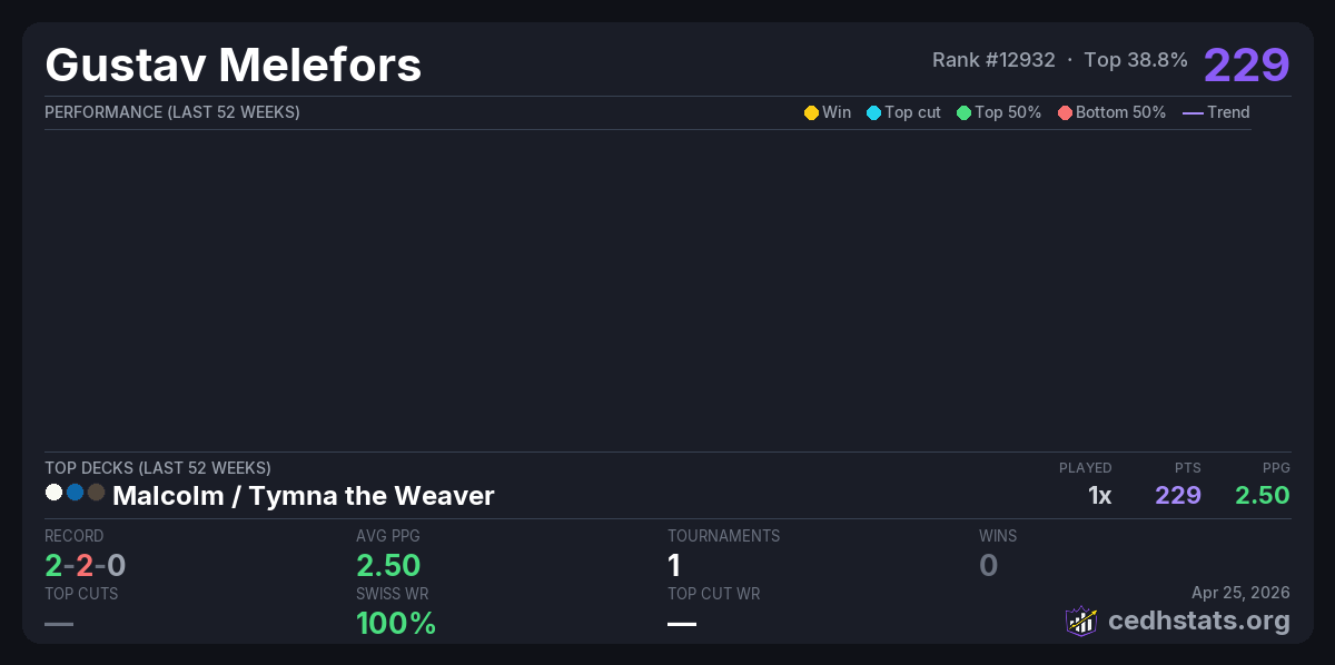 | TestUrMom Jul 22, 2025 · 23 players | Malcolm / Tymna | 3/23 | 2-2-0 | 2.50 | 229 |