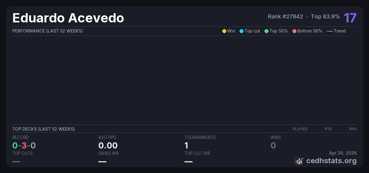 | Si hay cartas nuevas en Ba Sing Se (Flexo's Commander Night) Nov 21, 2025 · 16 players | Invalid pairing | 12/16 | 0-3-0 | 0.00 | 17 |