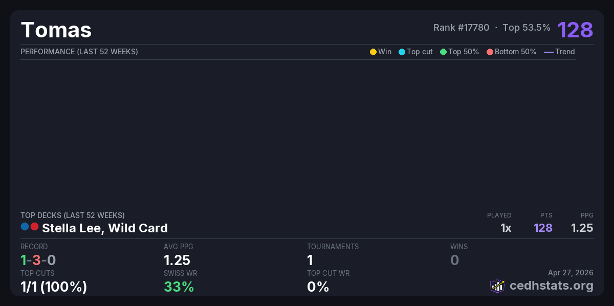 | Bcedh Magic Events Apr 25, 2026 · 22 players | Stella Lee, Wild Card | 9/22 | 1-3-0 | 1.25 | 128 |