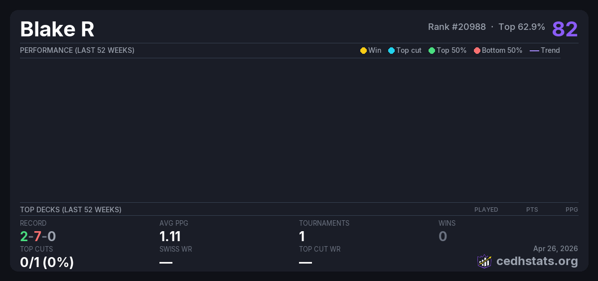 | The Iron Lion October CEDH League Oct 08, 2025 | — | 9/18 | 2-7-0 | 82 |