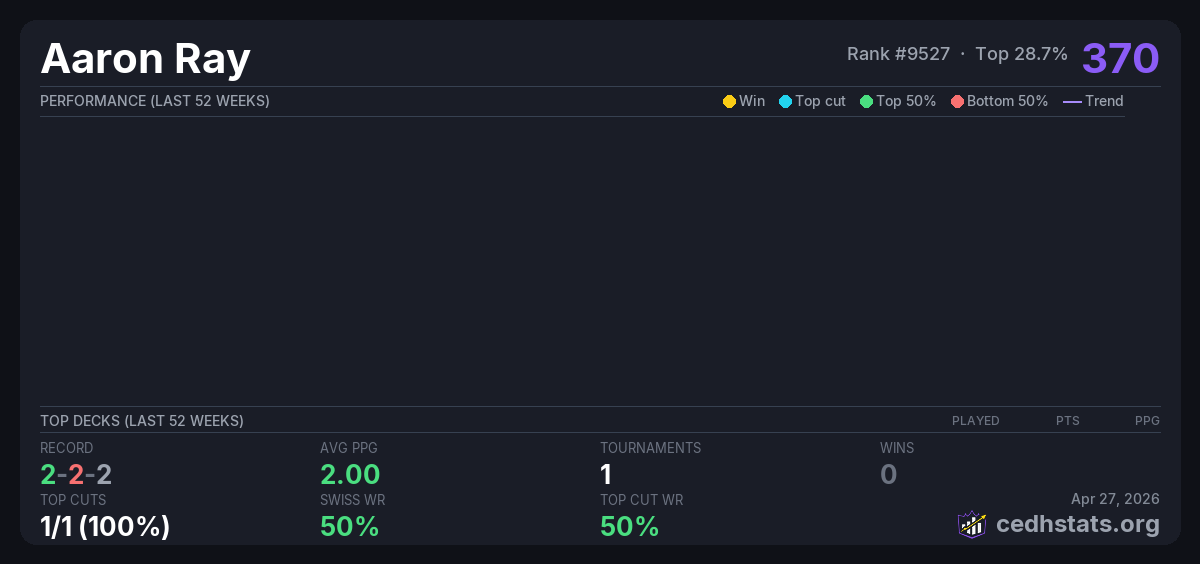 | CEDH at Chic & Geek Apr 26, 2026 | — | 4/20 | 2-2-2 | 370 |