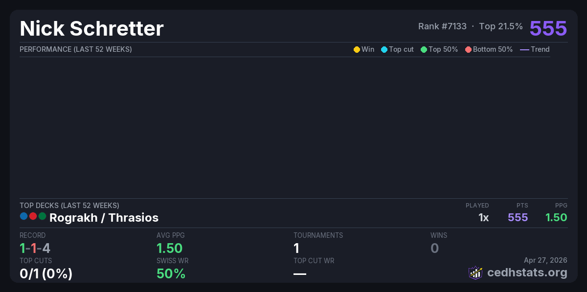 | Twisted Power - Midwest Gaming Classic TimeTwister Tournament Apr 25, 2026 · 172 players | Rograkh / Thrasios | 36/172 | 1-1-4 | 1.50 | 555 |