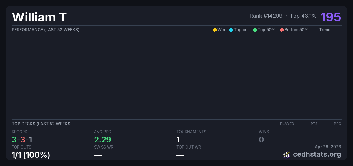 | The Iron Lion August CEDH League Aug 06, 2025 · 21 players | — | 4/21 | 3-3-1 | 2.29 | 195 |