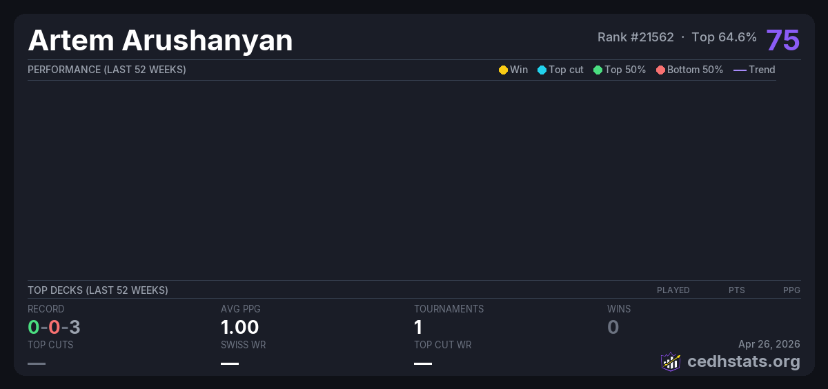 | Commander Tuesday - Nov 11th Nov 12, 2025 | Invalid pairing | 13/26 | 0-0-3 | 75 |