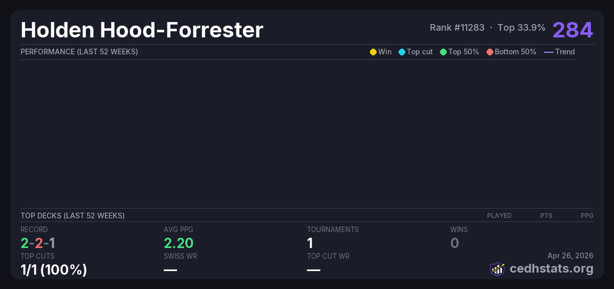 | 2025 July CEDH Jul 19, 2025 · 23 players | Invalid pairing | 5/23 | 2-2-1 | 2.20 | 284 |