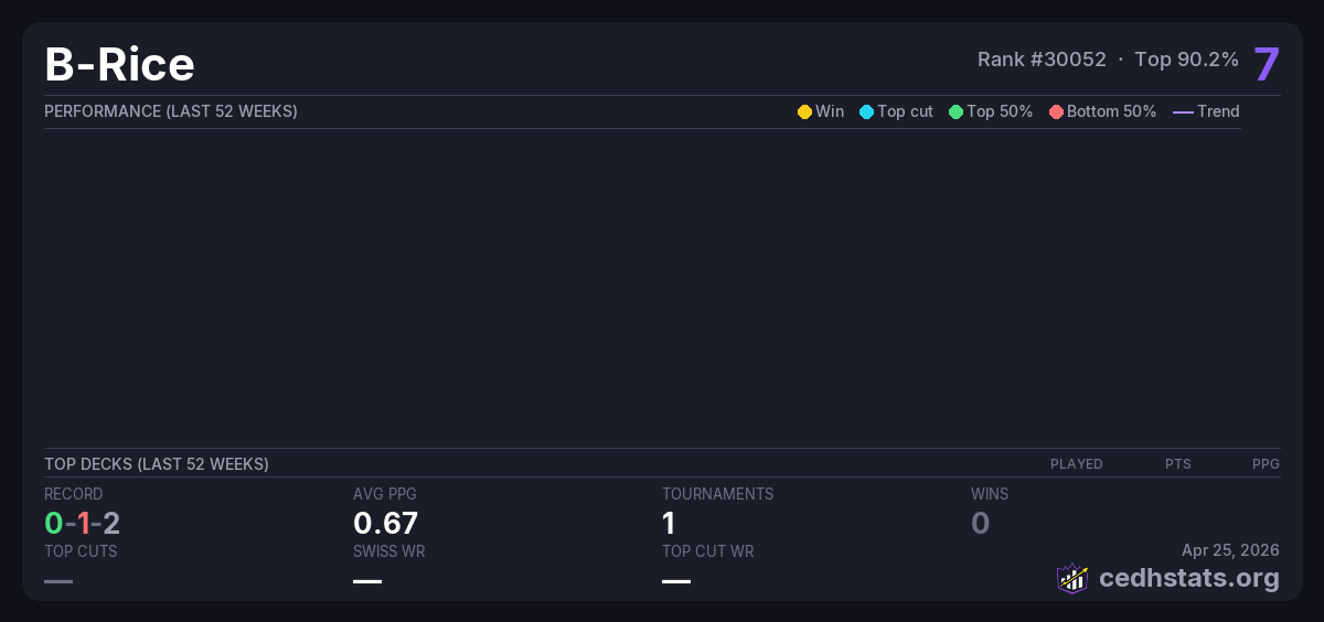 | Commander Precon League 2 Week 2 Aug 23, 2025 · 24 players | Invalid pairing | 21/24 | 0-1-2 | 0.67 | 7 |