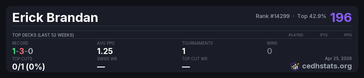 | Torneo Clasificatorio al HoF en el Ojo Apr 26, 2025 | Invalid pairing | 17/33 | 1-3-0 | 82 |