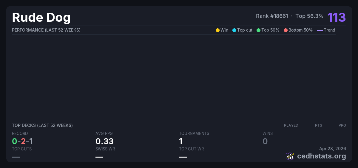 | Commander Precon League 2 Week 3 Aug 30, 2025 · 28 players | Invalid pairing | 12/28 | 0-2-1 | 0.33 | 113 |