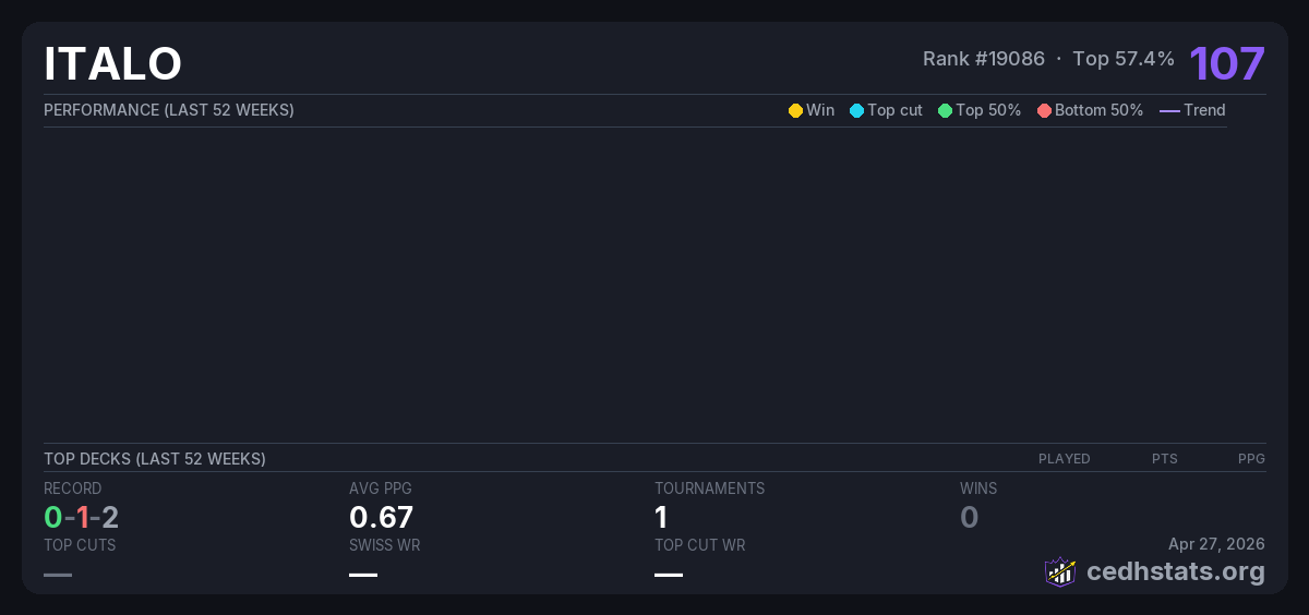 | PARA Jul 15, 2025 · 16 players | Invalid pairing | 6/16 | 0-1-2 | 0.67 | 107 |