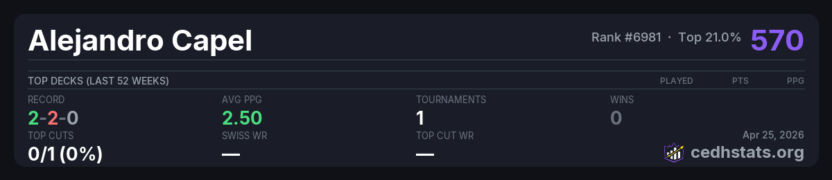 | Torneo Clasificatorio al HoF en el Ojo Apr 26, 2025 | Inalla, Archmage Ritualist | 5/33 | 2-2-0 | 238 |