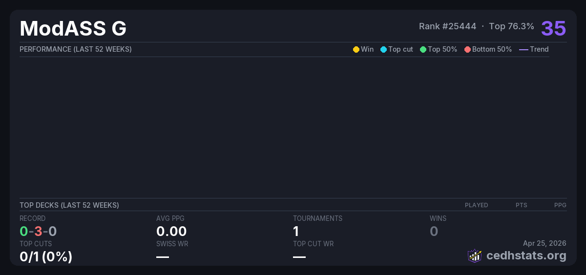 | Thirsty Thursday Nov 13, 2025 · 24 players | Invalid pairing | 16/24 | 0-3-0 | 0.00 | 35 |