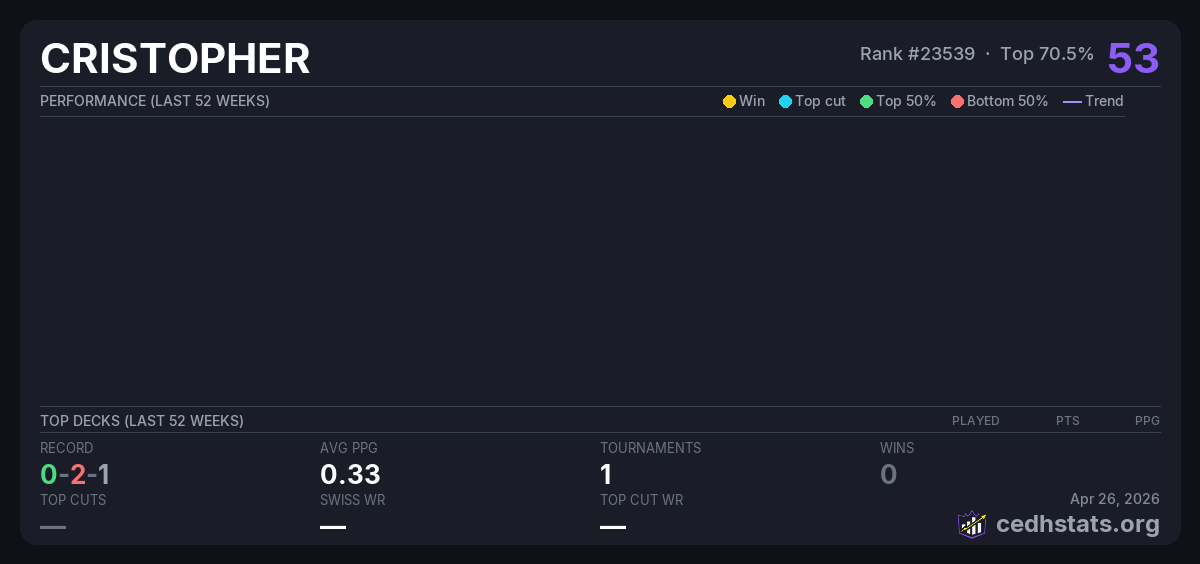 | paraple Dec 02, 2025 · 16 players | 9/16 | 0-2-1 | 0.33 | 53 |