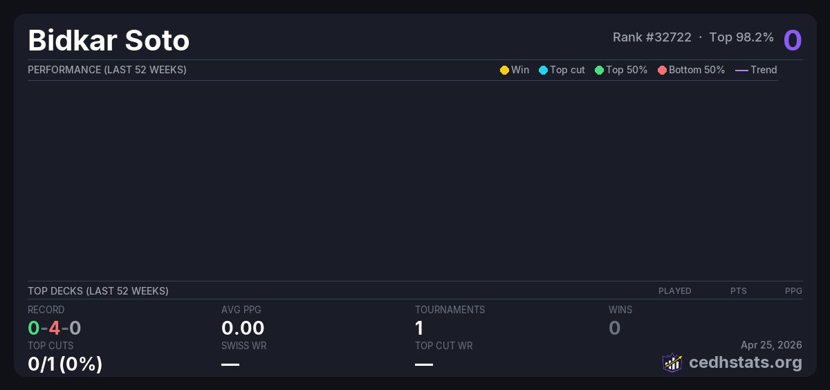 | 2.5k CEDH Tournament Quiche 2025 (Guatemala) (Copy) Aug 09, 2025 | Invalid pairing | 24/24 | 0-4-0 | 0 |