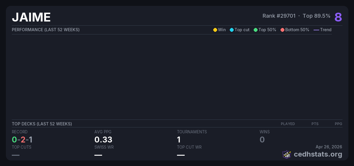 | CEDHX Oct 23, 2025 · 16 players | Invalid pairing | 14/16 | 0-2-1 | 0.33 | 8 |