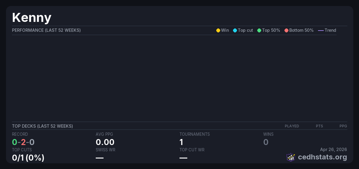 | MTG Chaos Commander! Oct 25, 2025 · 16 players | Invalid pairing | 10/16 | 0-2-0 | 0.00 | — |